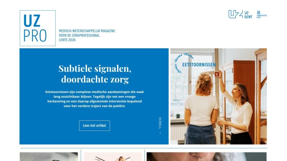 UZ PRO. Driemaandelijks medisch-wetenschappelijk magazine van het Universitair Ziekenhuis Gent | Hoofdredacteur prof. dr. Steven Weyers | Redactiecoördinatie Marie-Laure Solie, +32 9 332 46 47, communicatie@uzgent.be | Fotografie Björn Comhaire, Eva Vlonk, iStock | Illustraties Elise Buntinx | Concept, redactie en realisatie www.jaja.be | V.U. Steven Weyers, C. Heymanslaan 10, 9000 Gent | De redactie voor deze editie werd afgesloten op 26 februari 2026.